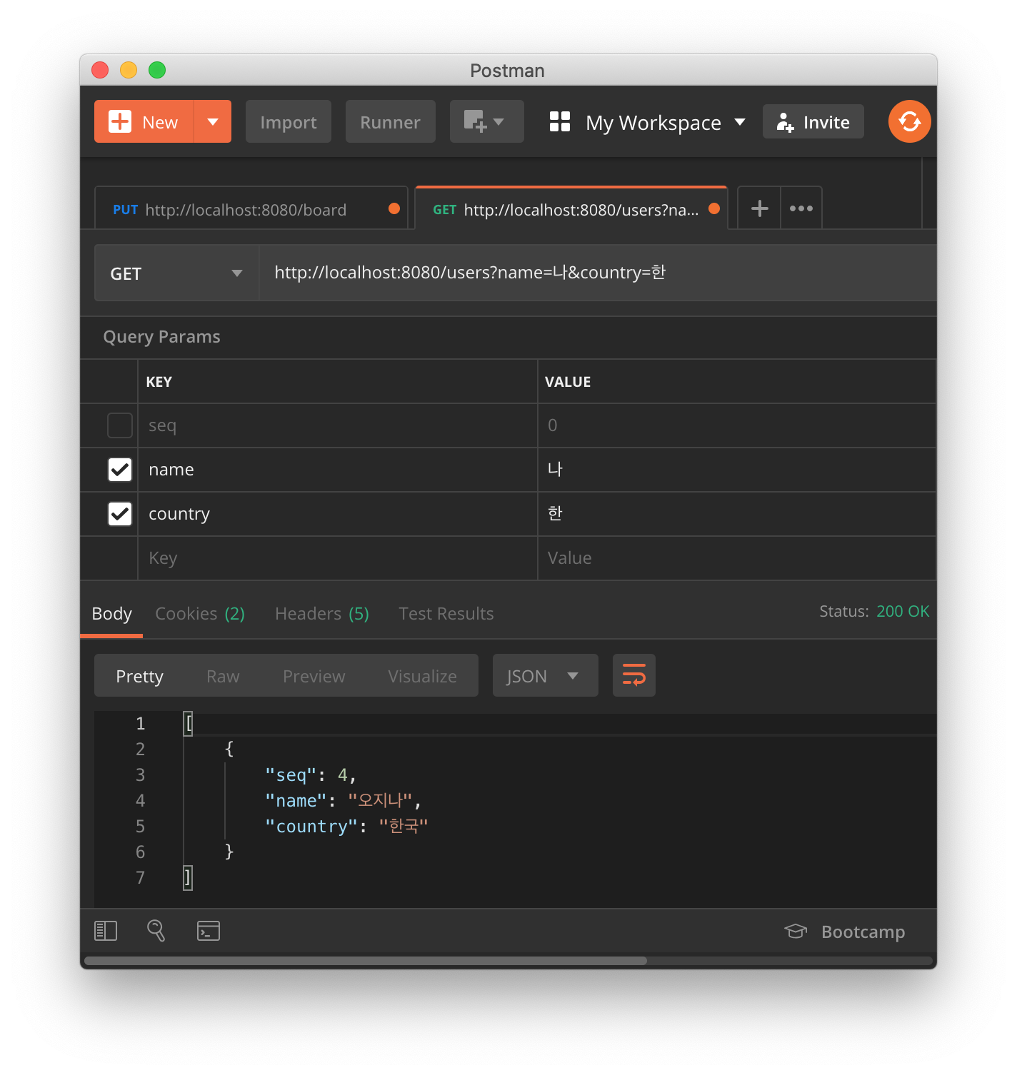 전달한 파라미터에 seq는 없기 때문에 생략하고, country와 name 조건이 추가될 것임을 예상할 수 있습니다.