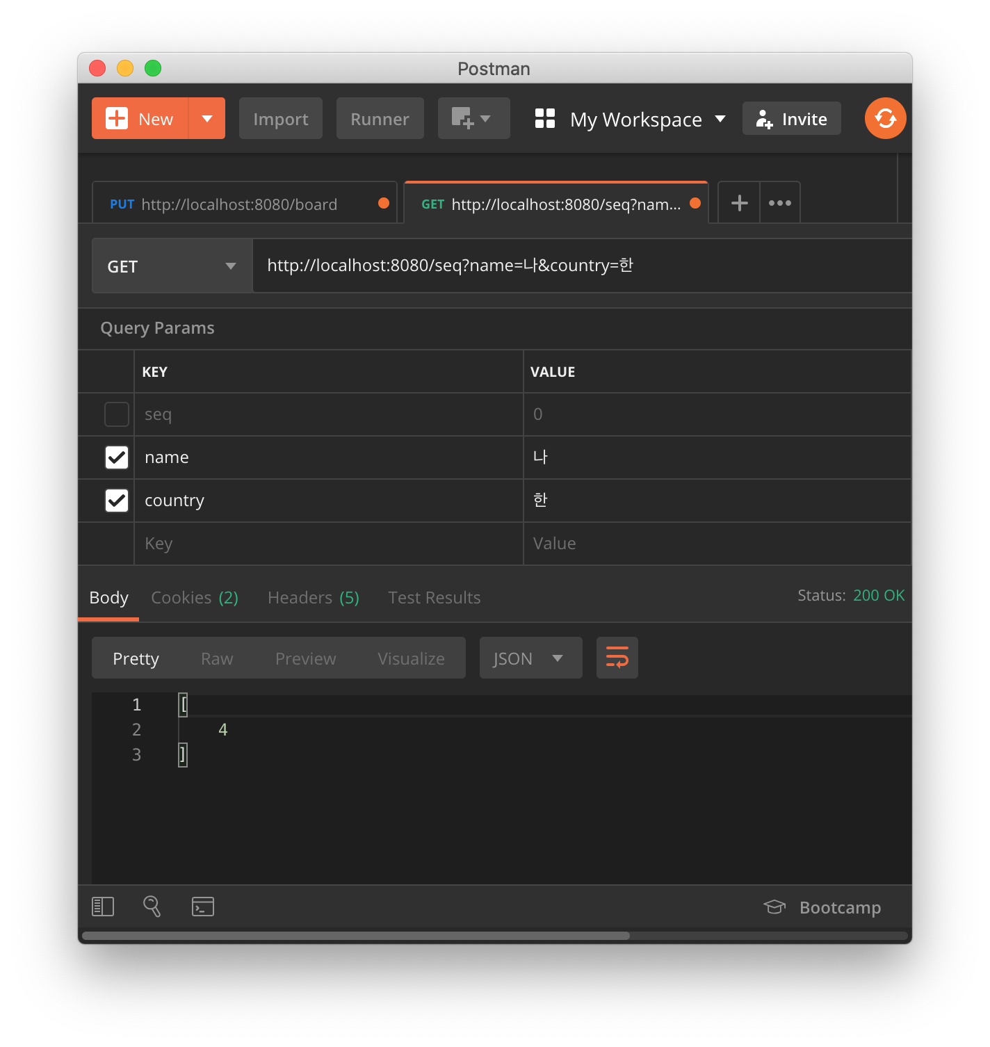 전달한 파라미터에 seq는 없기 때문에 생략하고, country와 name 조건이 추가될 것임을 예상할 수 있습니다.