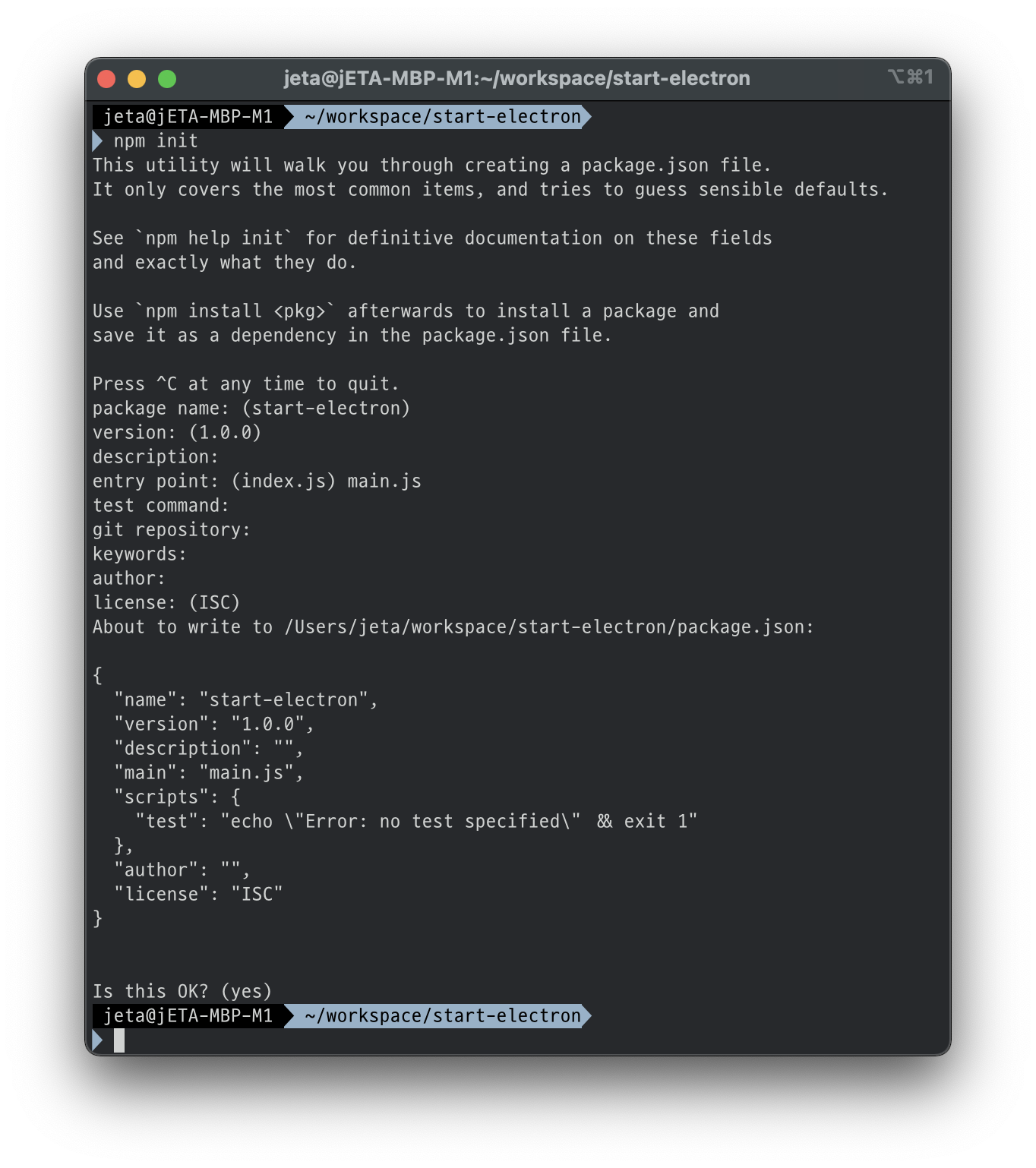 먼저 적당한 이름(start-electron)의 빈 디렉토리를 생성하고, 아래 명령어를 실행하여 패키지를 초기화 합니다.