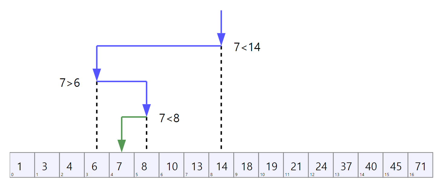 중앙값이 찾는 값보다 크면 새로운 최댓값으로, 작다면 새로운 최솟값으로 설정하여 다시 탐색을 시작한다.