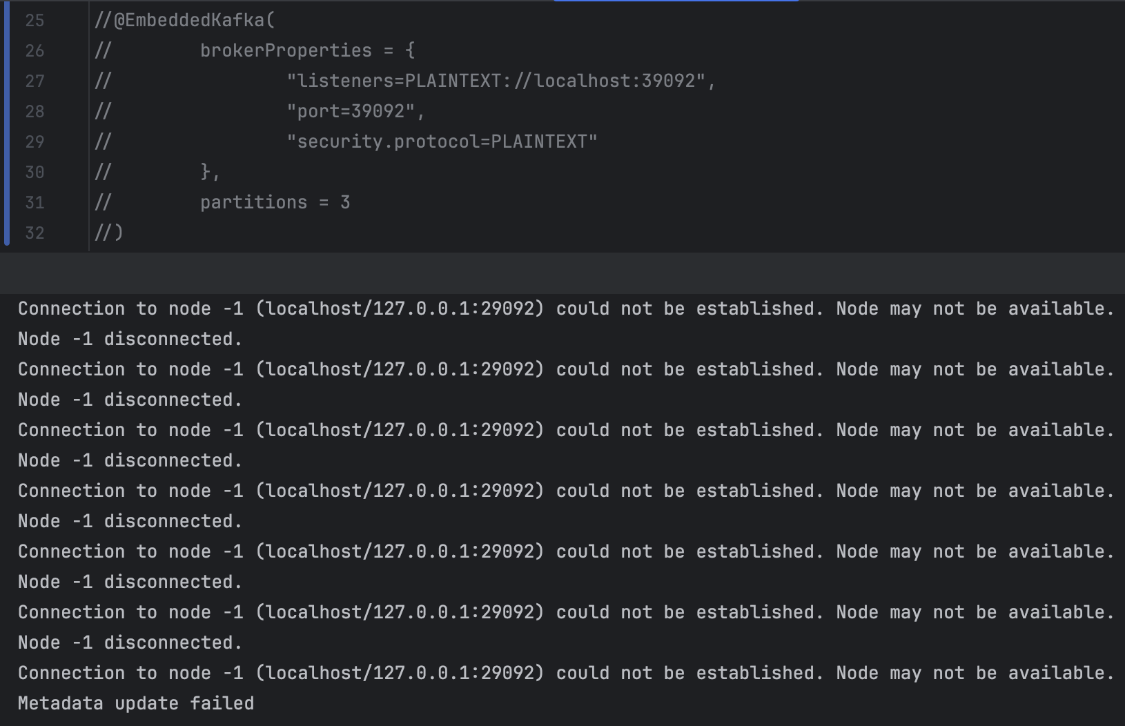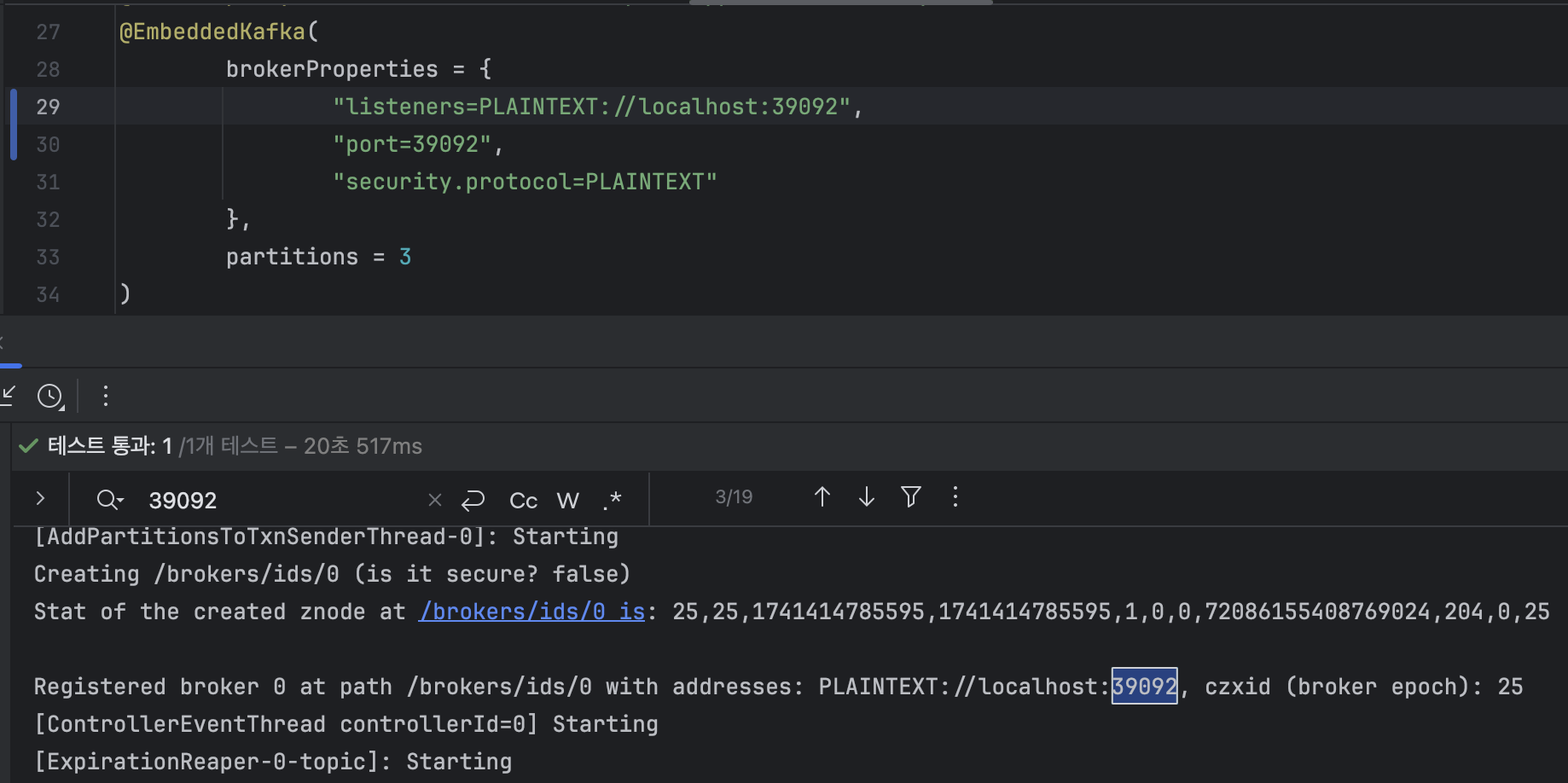 이렇게 선언하면 해당 클래스에서의 테스트는 EmbeddedKafka 환경에서 수행됩니다.