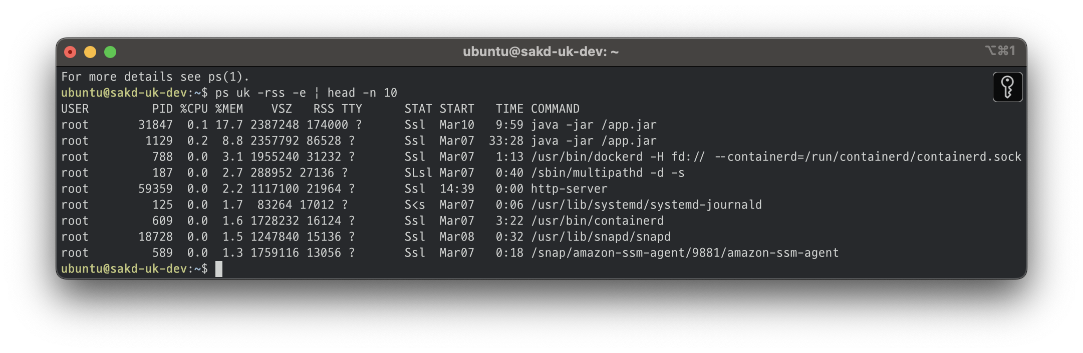 - k -rss: 전달된 기준으로 정렬한다. -rss는 RSS(메모리 점유율) 기준 내림차순(-)을 의미한다.