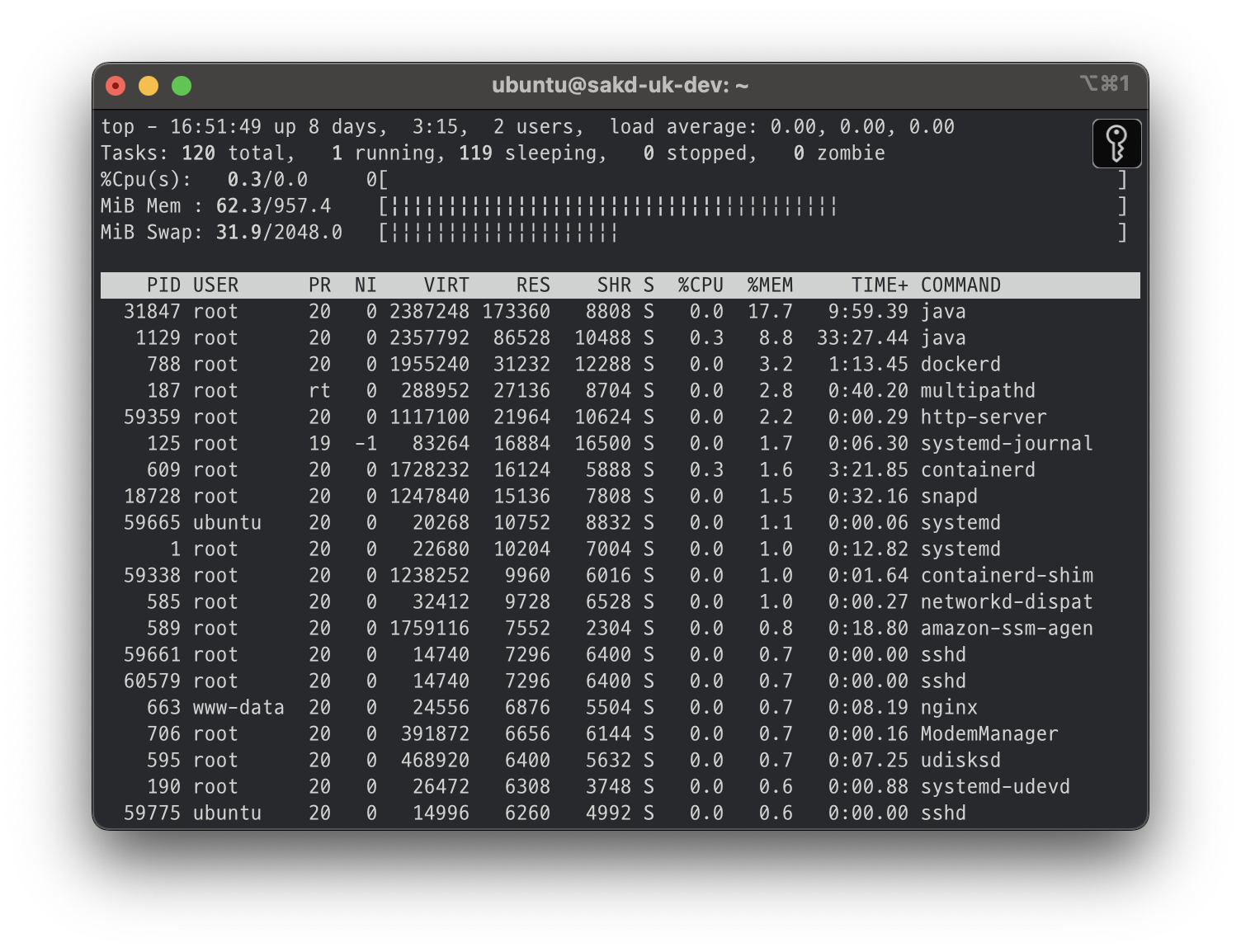 서버에 ssh 로 접속하여 top 을 실행하면 프로세스별 시스템 자원 사용량을 집계하여 보여줍니다.