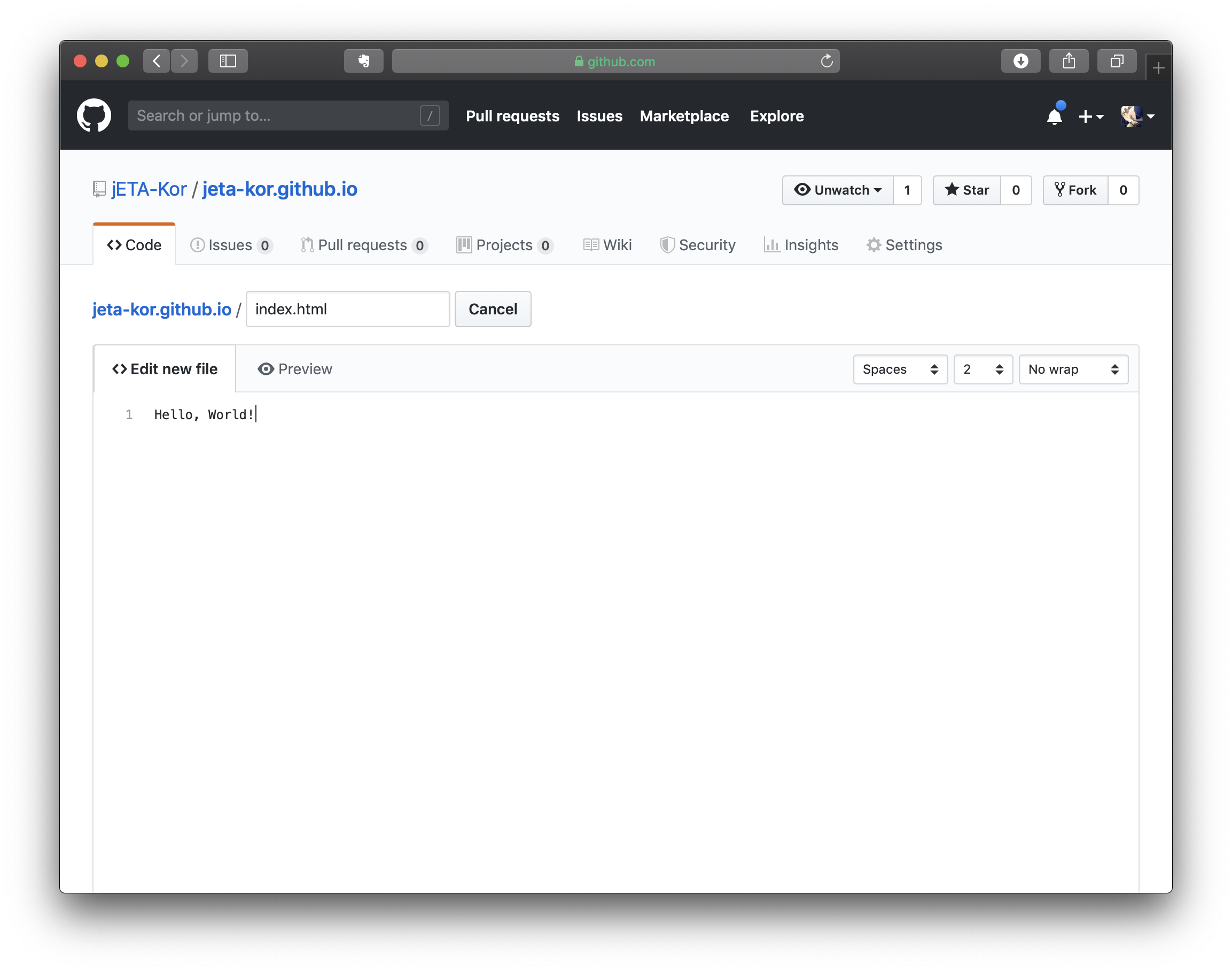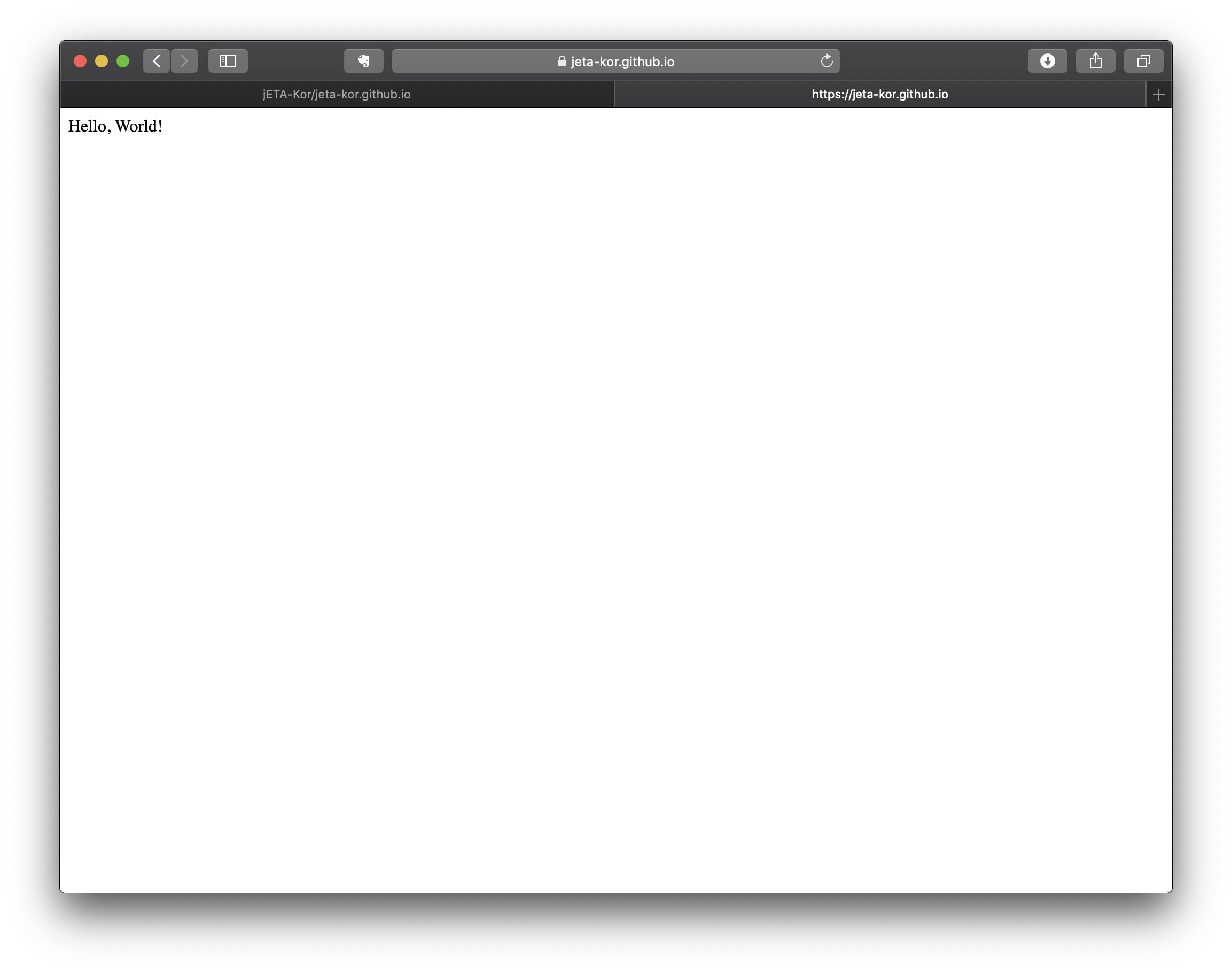 4. 잠시 후 username.github.io에 접속하면 Hello, World!가 표시됩니다.