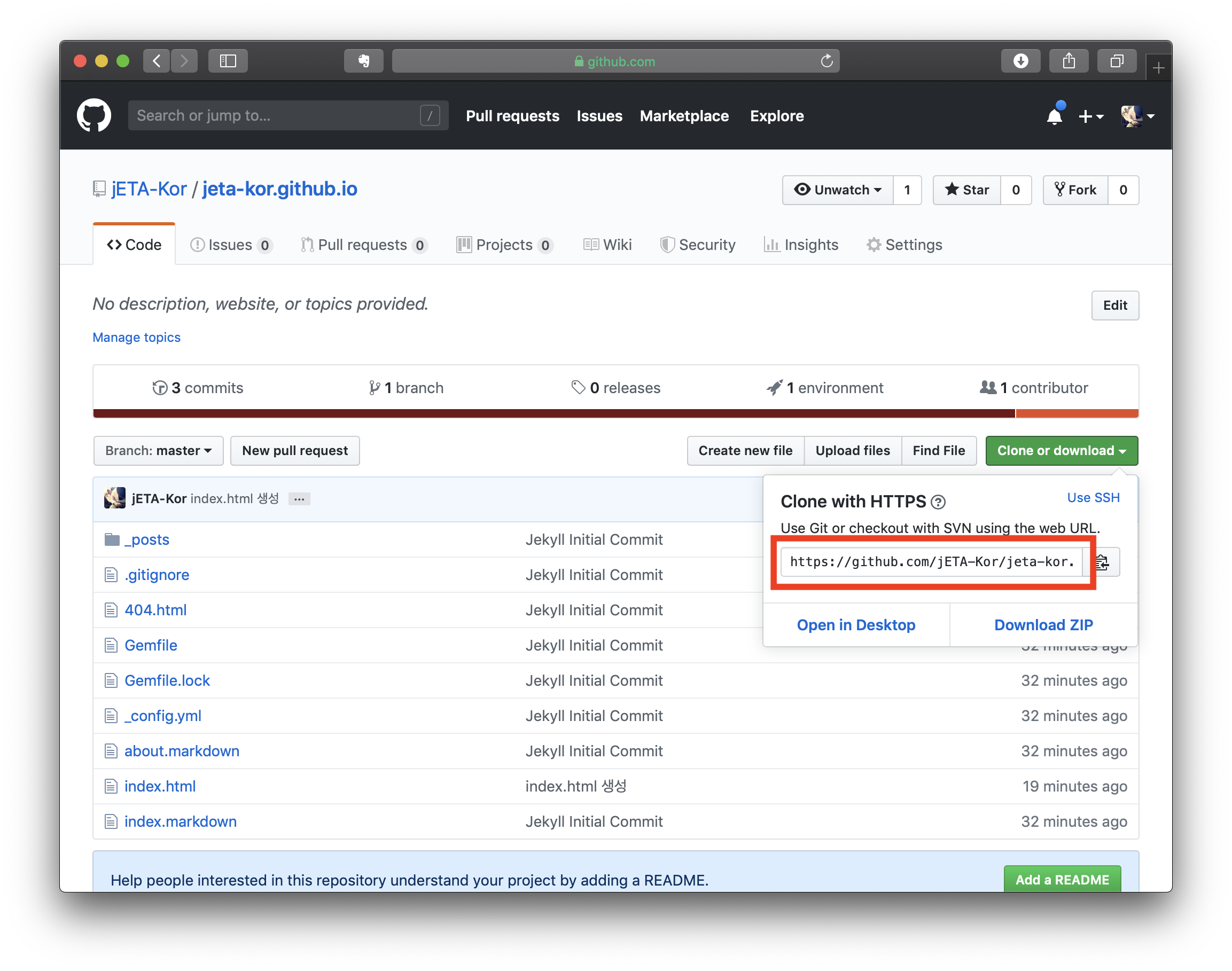 $ git clone https://github.com/jETA-Kor/jeta-kor.github.io.git # 제 경로는 이렇게 됩니다.