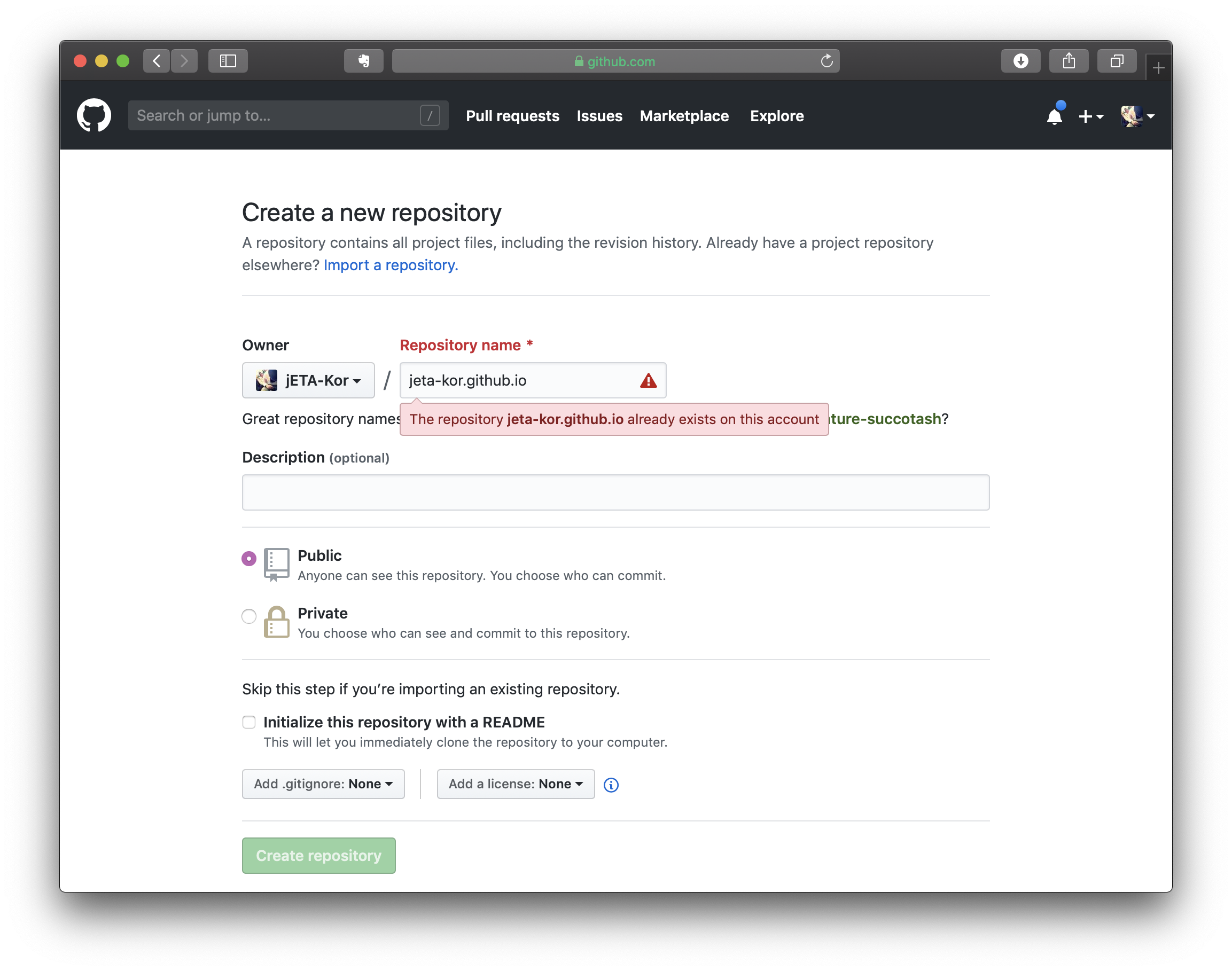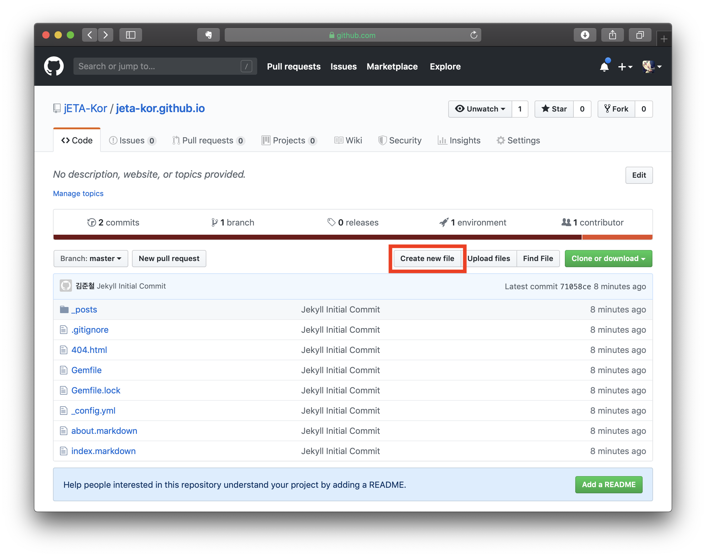 예를 들어 GitHub ID가 jETA-Kor라면 jeta-kor.github.io로 이름을 지어주면 됩니다.