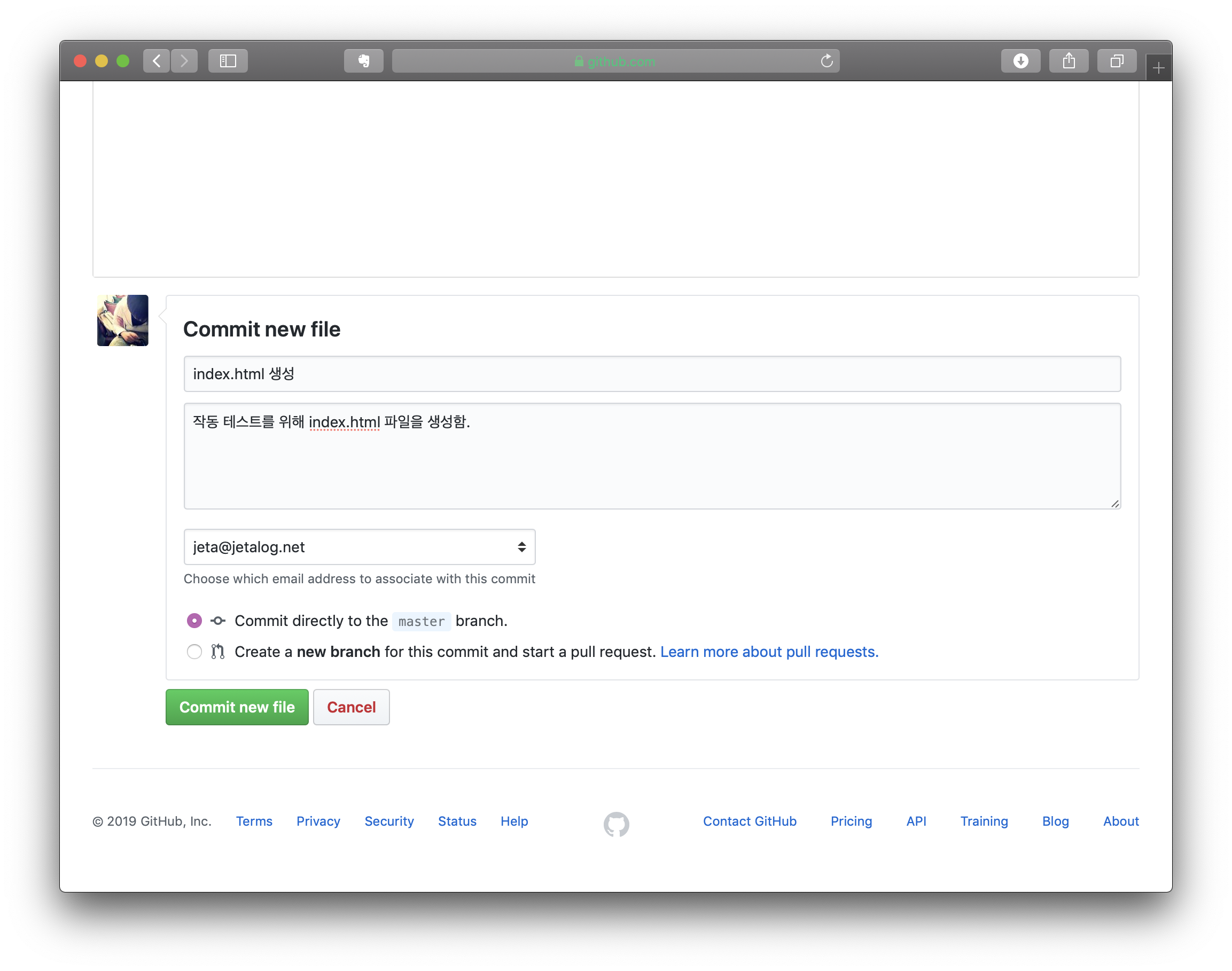 3. Commit Log를 작성하고 Commit new file를 선택합니다.