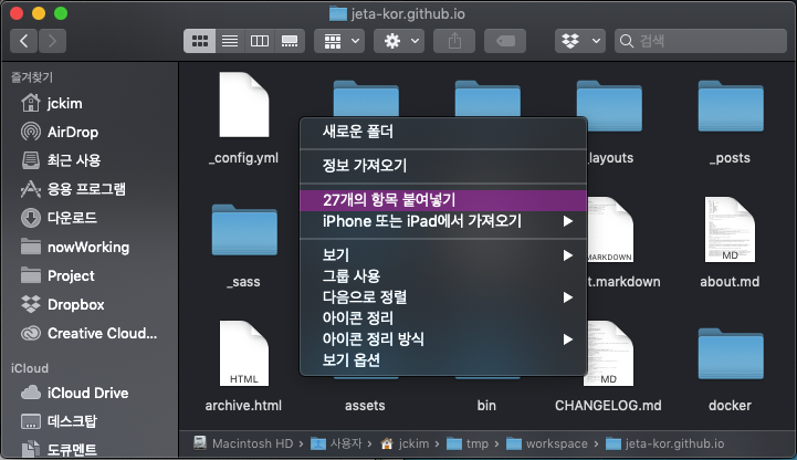 1. 다운 받은 테마의 모든 파일을 Jekyll을 설치한 디렉토리로 복사합니다.
