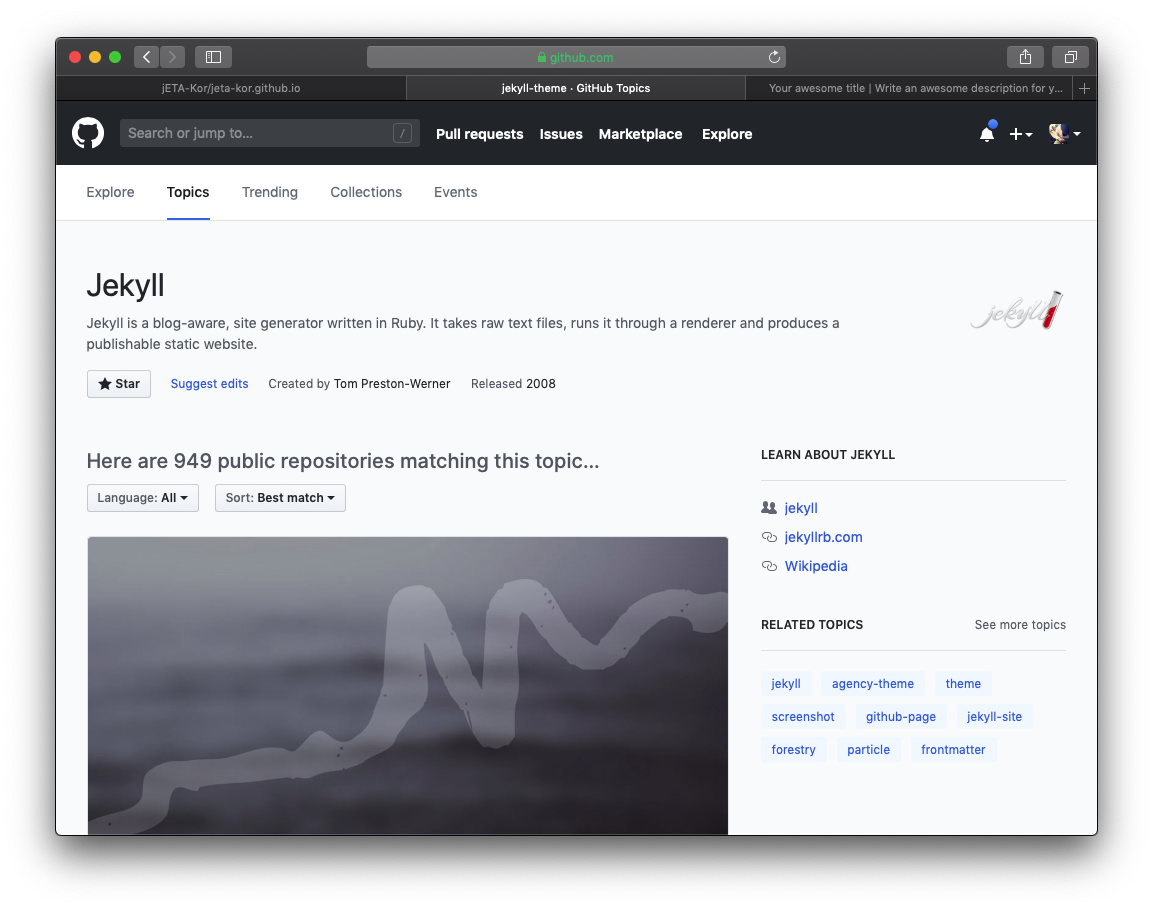 1. GitHub에는 훌륭한 여러 테마가 공개되어 있습니다. jekyll-theme 등의 토픽을 확인해서 맘에 드는 테마를 고릅니다.