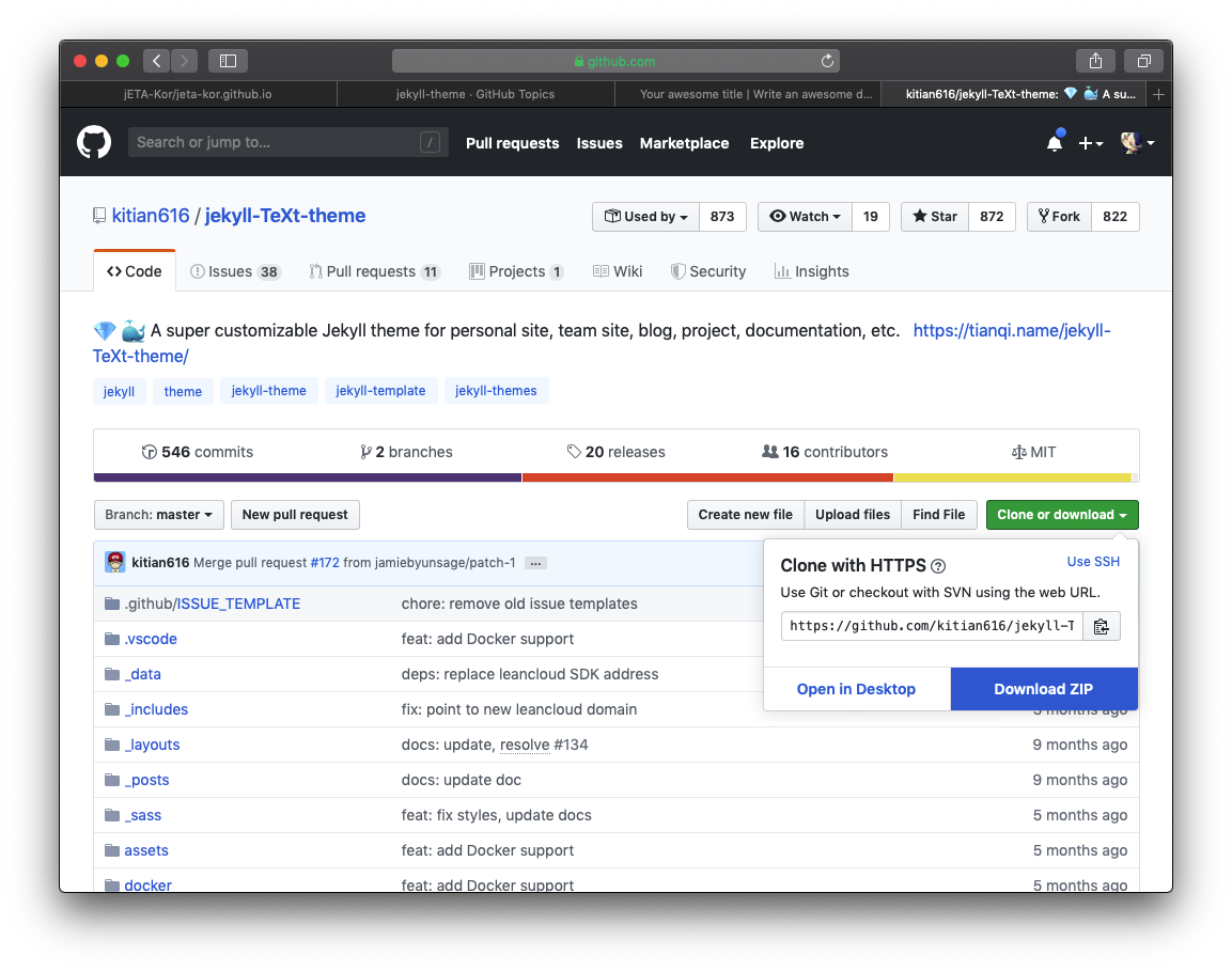 2. 맘에 드는 테마를 골랐다면 소스코드를 다운로드합니다. 조금 더 고급스럽게 작업하고 싶다면 Repository를 Clone하는 방법도 있습니다.