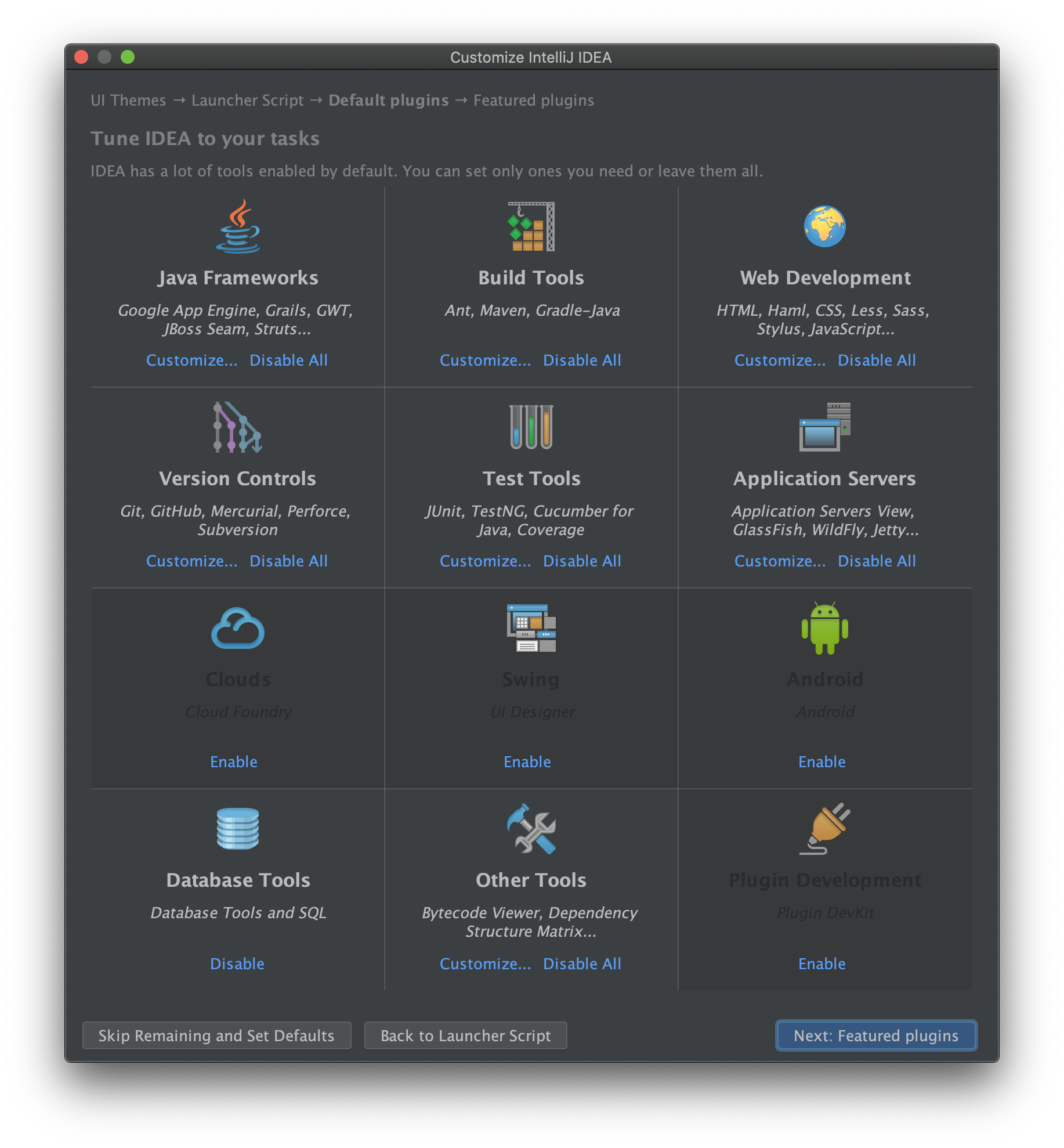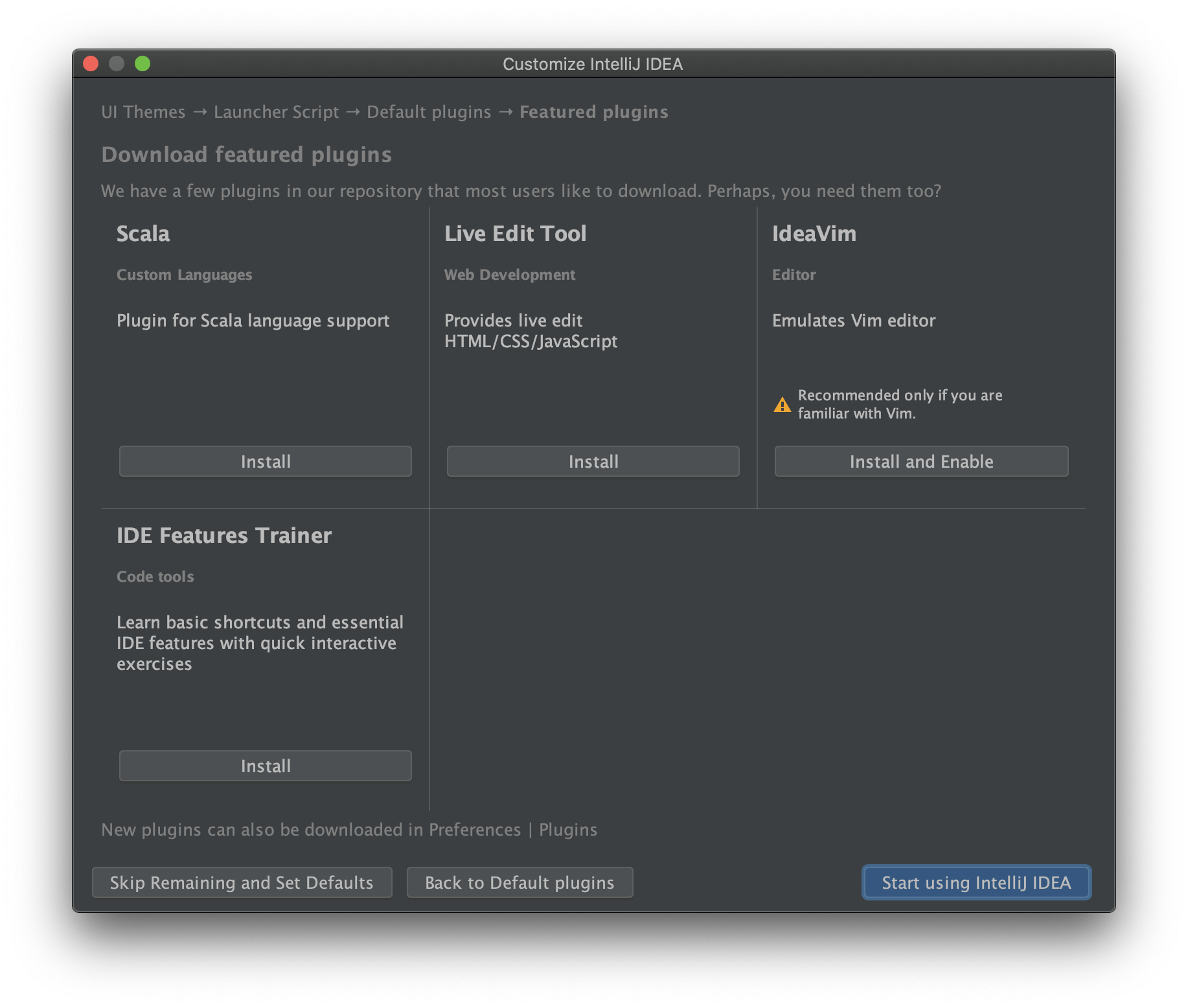 필요한 도구를 설치하고, Start using IntelliJ IDEA를 누르면 설정이 완료됩니다.