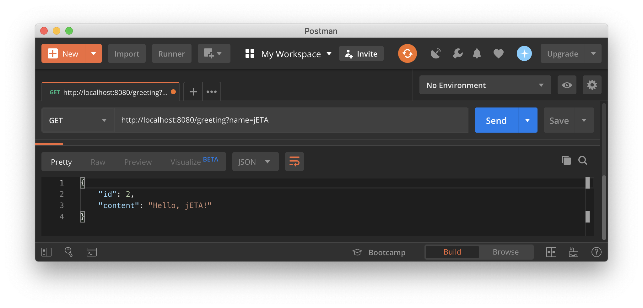 다음과 같이 QueryString 파라미터 name을 추가하면 이전과 다른 응답을 받을 수 있습니다: http://localhost:8080/greeting?name=jETA
