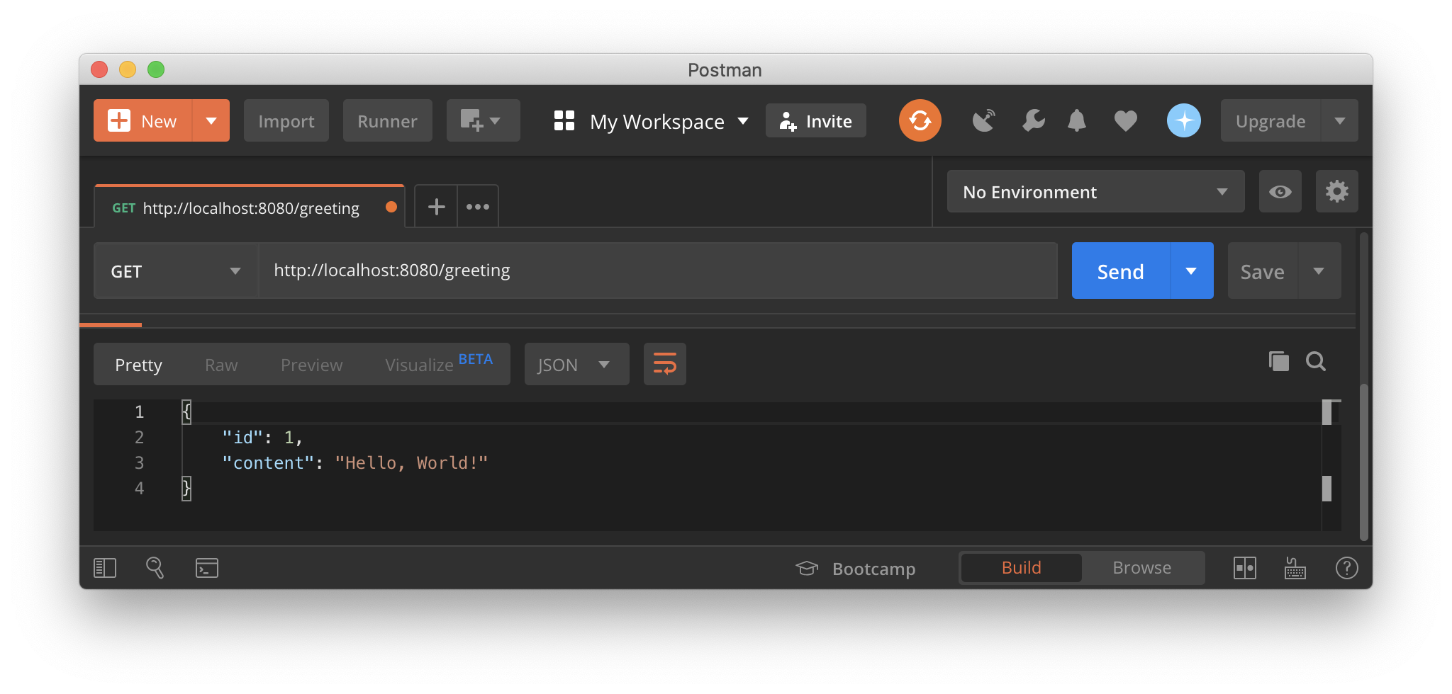 정상적으로 실행되면 Postman이나 curl 등의 도구를 이용해 다음 API를 호출합니다: http://localhost:8080/greeting