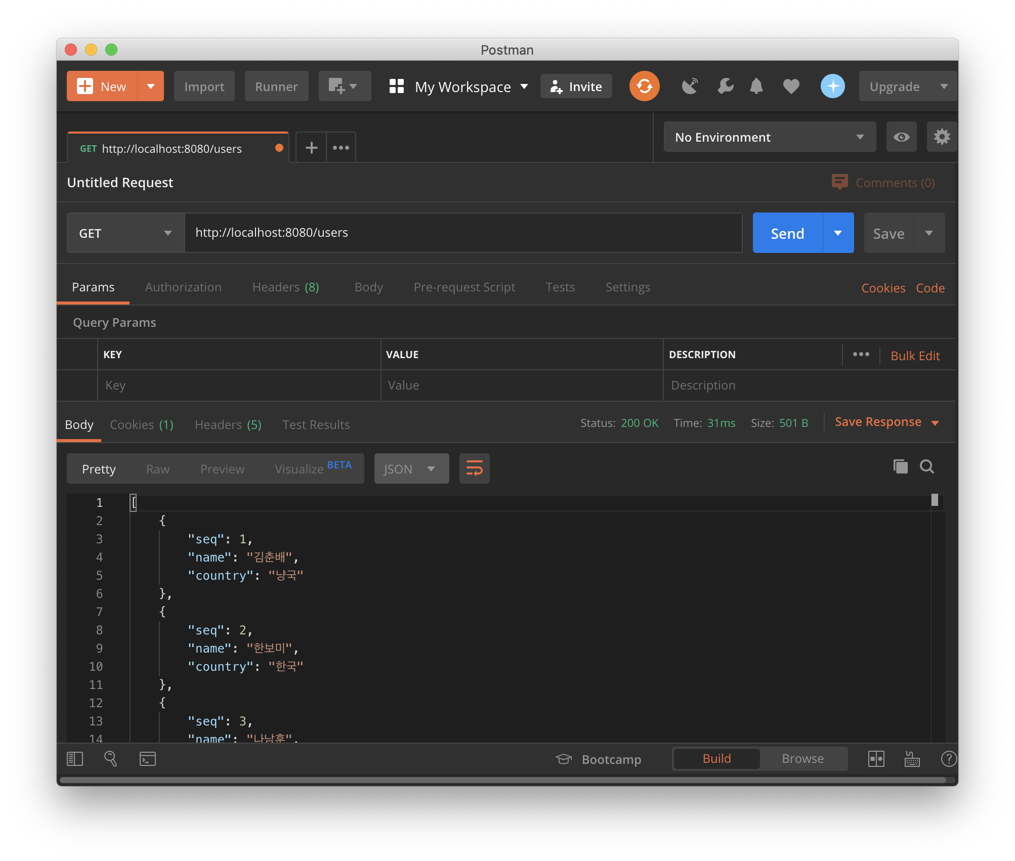 서버를 실행하고 다음 API를 호출하면 아래와 같은 응답을 받을 수 있습니다: http://localhost:8080/users