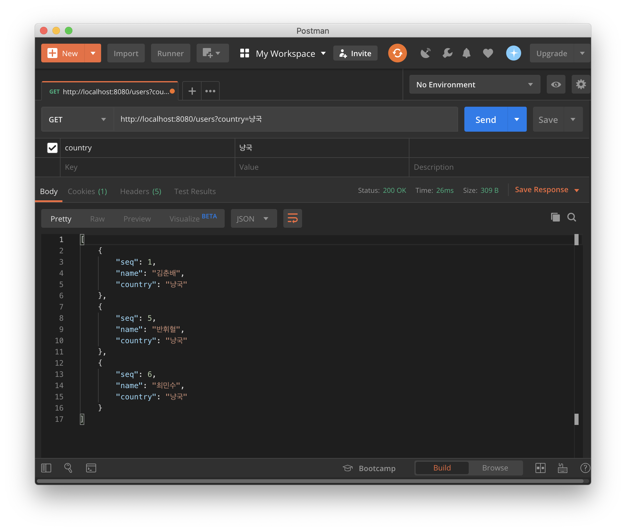 마찬가지로 다음 API를 호출하면 냥국의 냥인만 조회할 수 있습니다: http://localhost:8080/users?country=냥국
